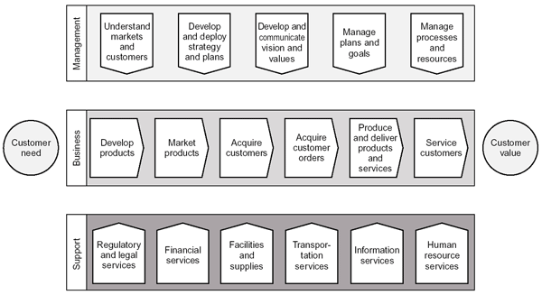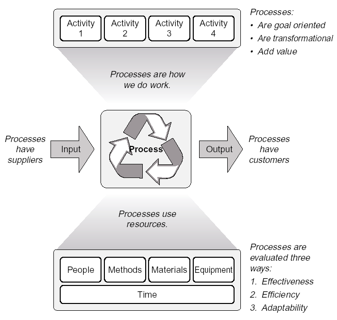 A process also can be viewed as a "value chain," in which each activity or step contributes to the end result. Some activities directly contribute value, while others may not.